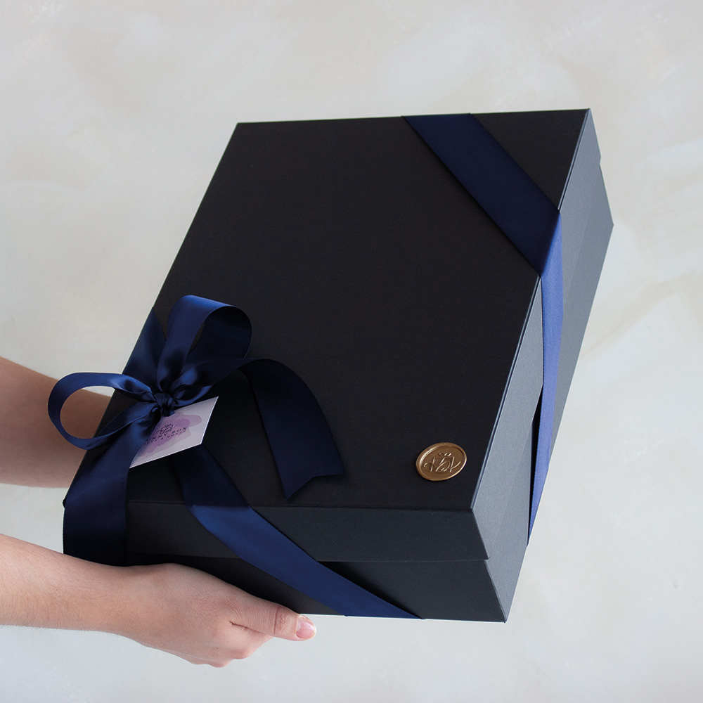 Tu arreglo incluye: caja rígida rectangular y espaciosa en color negro, papel relleno (viruta), listón, decoración y tarjeta para dedicatoria según la ocasión.