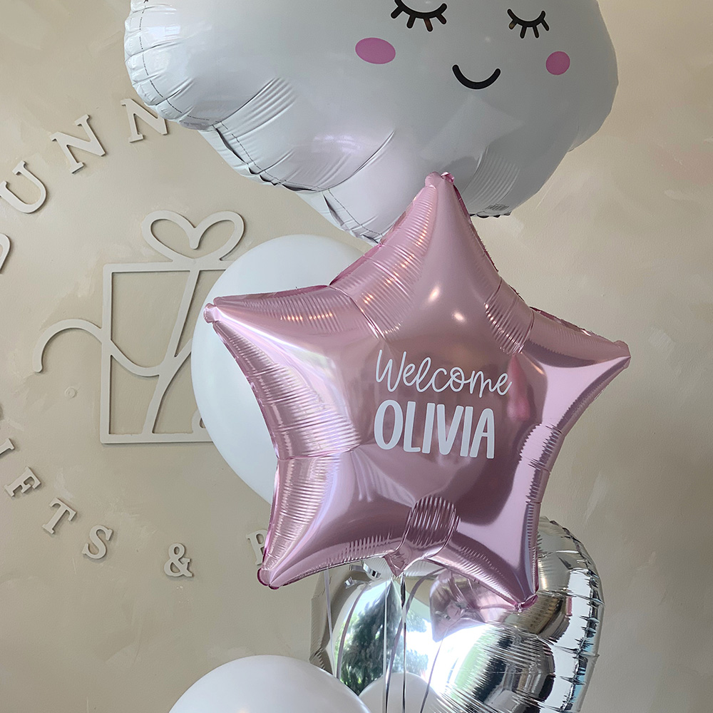 Globo en forma de nube grande 30″ color blanco, globo foil estrella personalizada con el nombre de la bebé, corazón foil, 2 látex color sólido blanco. Combinación de globos acorde a stock manteniendo paleta de colores.