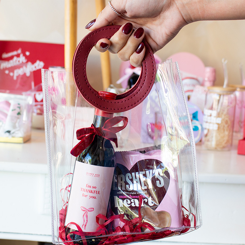 Bolsa plástica reutilizable con asa redonda*, mini vino rosado Sutter Home variedad, scrunchie para cabello color según stock, chocolate Hershey’s variedad segun stock, papel relleno, listón y tarjeta acorde a la ocasión. NOTA: favor notar en la segunda foto el diseño de la bolsa.