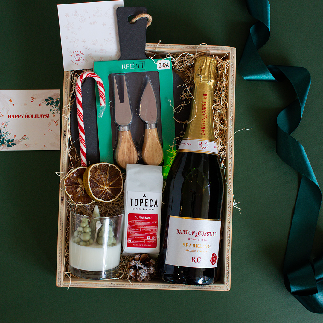 Vino Espumante BG Alcohol Free 750 mL, TOPECA Café mini bag 3oz, vela aromática decorativa pinos, tabla para charcutería de piedra 3 pzas, accesorios para untar, dulce de bastón navideño, empacado de regalo en caja madera tip bandeja, viruta de especial de madera, decoración, listón y envoltorio con plástico premium.