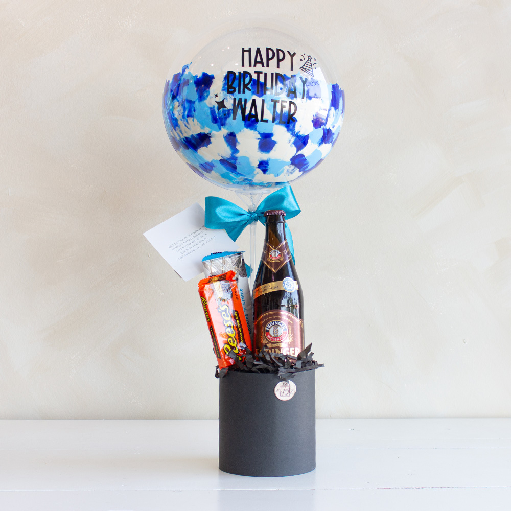 Cerveza Erdinger 500 ml, dos chocolates (M&M, Snickers, MilkyWay, Reese’s o Hershey’s), chocolate Ferrero Rocher, arreglo sobre base bucket premium color según stock, globo burbuja con pintura, personalizado con frase “Happy Birthday”, tarjeta dedicatoria según la ocasión.