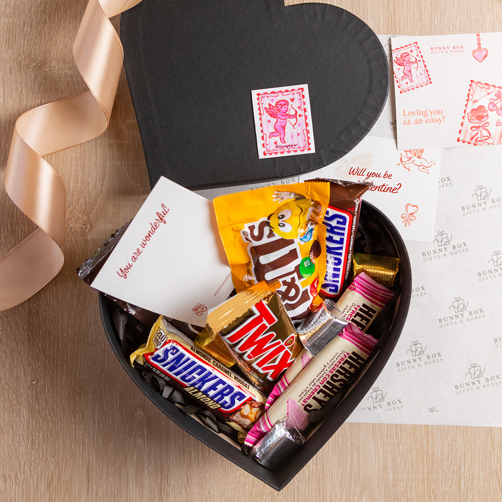 Incluye una selección de 7 chocolates variados y de diferentes tamaños, entre: KitKat, Crunch, Hershey’s, Snickers, M&M, Hershey’s Unicorn mini, entre otros. Todo perfectamente empacado en una caja en forma de corazón, elaborada de un material premium lo cual la hace perfecta para re utilizar. Incluye listón y tarjeta dedicatoria según la ocasión.
