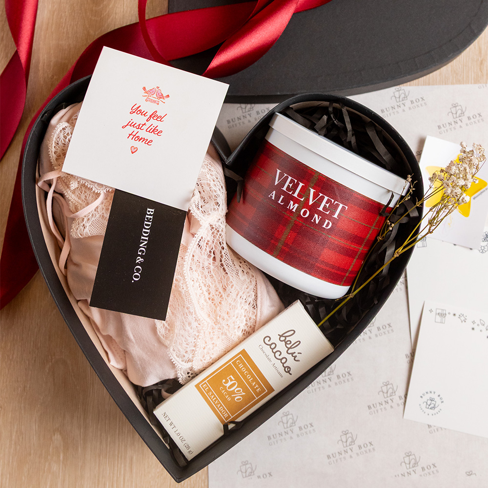 Empacado por las manos mágicas de Bunny Box en una de nuestras cajas de línea premium en forma de corazón color negro, pijama lace en color rosa suave, vela aromática grande, barrita de chocolate gourmet Belú Cacao, incluye tapa, listón y tarjeta dedicatoria. *NOTA: elige tu talla de pijama.