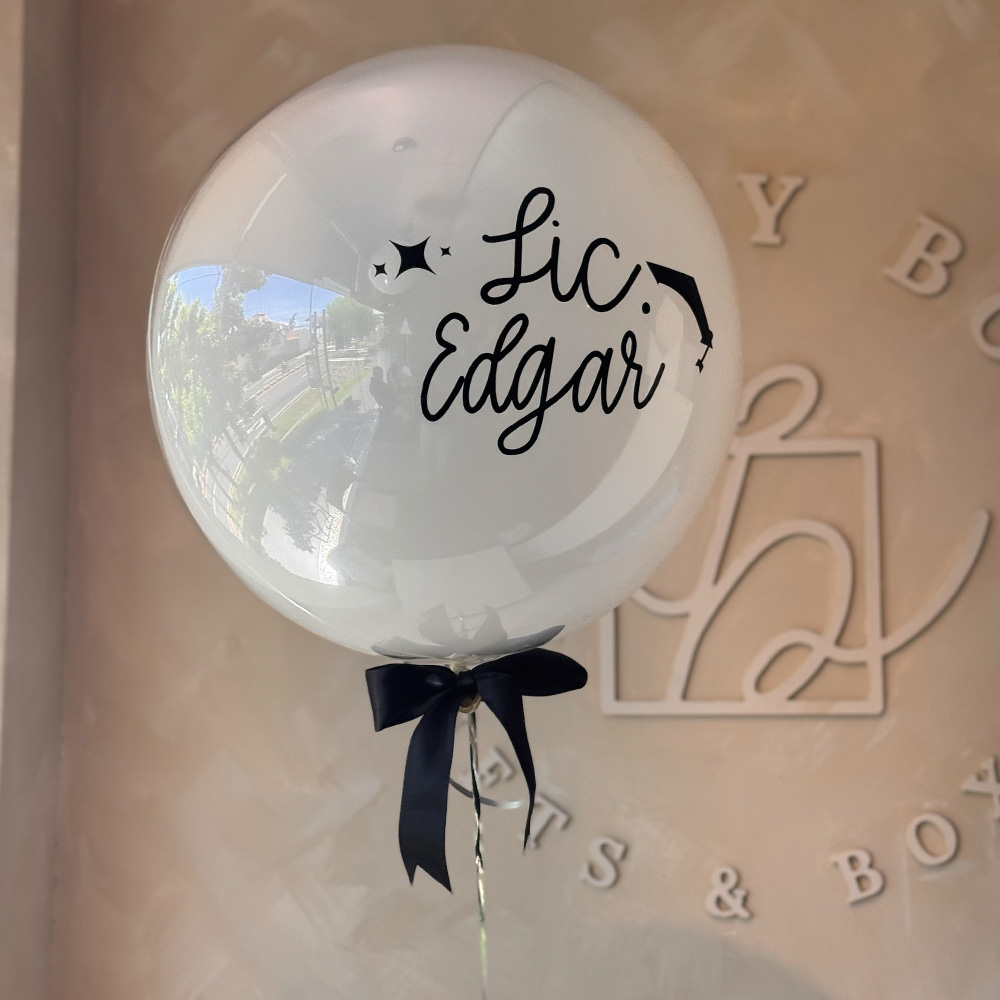 Globo látex dentro de un globo burbuja que le da una apariencia brillosa, inflado con helio, puede durar intacto por máximo 18-24 horas. Incluye personalizado con frase corta y contrapeso.