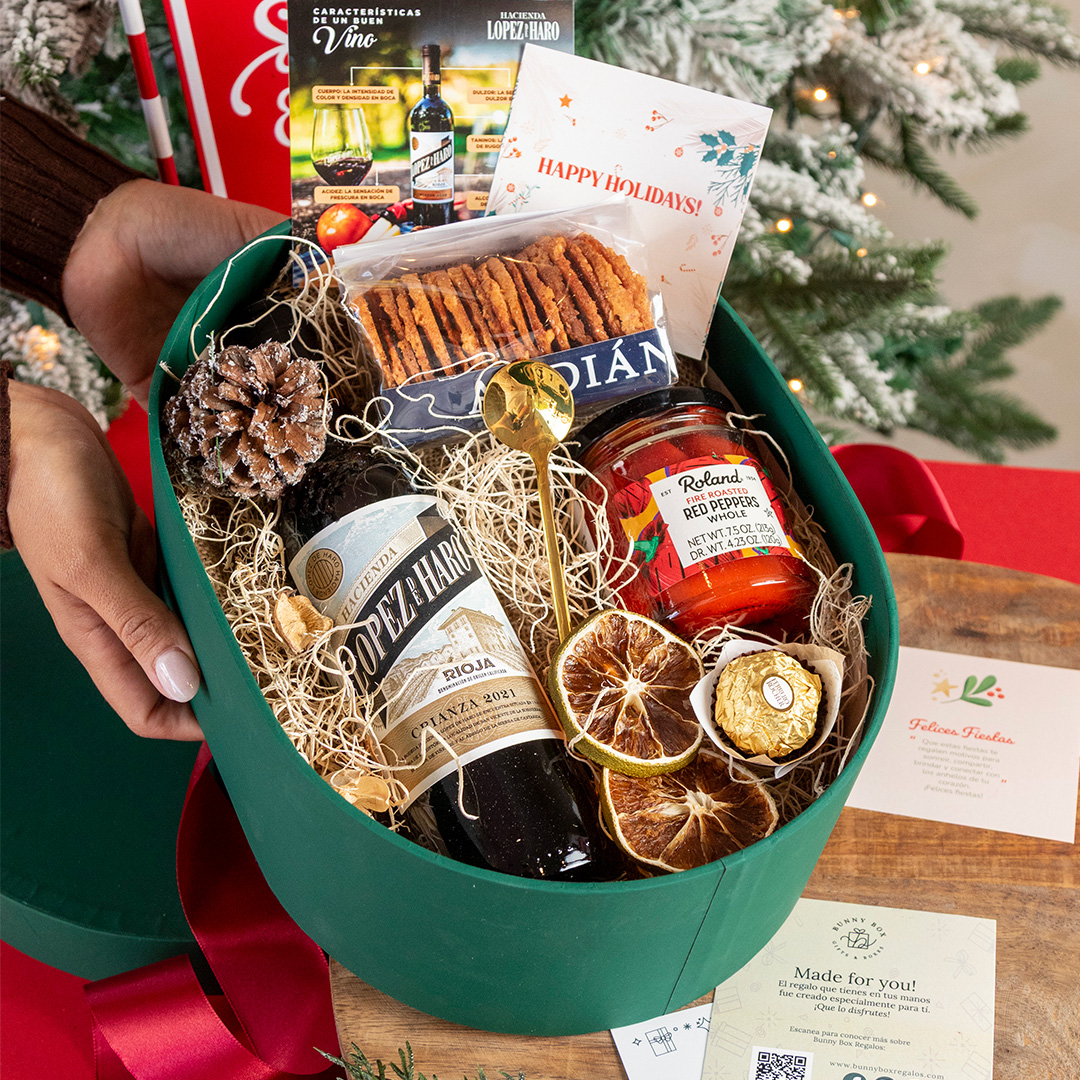 Botella de vino Lopez de Haro Crianza 375ml, chocolate Ferrero Rocher unidad, paquete de tejas de coco Andian, mermelada artesanal Bebas 6oz, mini cucharita dorada, viruta especial, empacado de regalo en caja especial de temporada semi-ovalada premium, decoración y listón exterior y tarjeta para dedicatoria acorde a la ocasión.