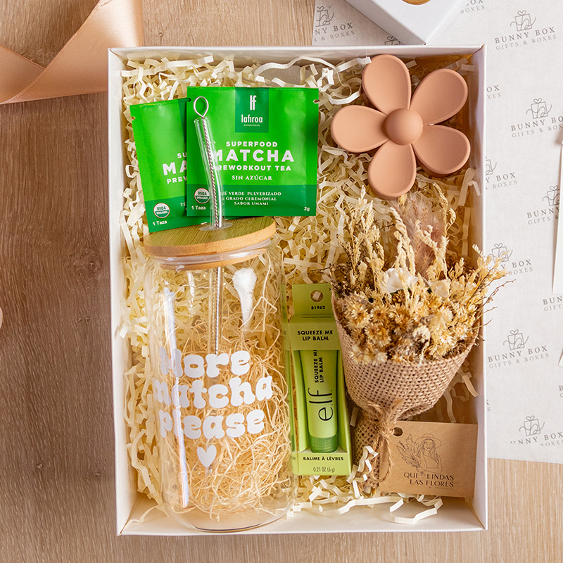 Glass cup perfecto para matcha o iced coffee, lip gloss e.l.f, ramito de flores preservadas en manta, clip para cabello en forma de flor en colores nude, 2 sobres de matcha soluble by lafiroa. Empacado de regalo en caja tradicional blanca con viruta de papel especial, listón y tarjeta dedicatoria acorde a la ocasión.