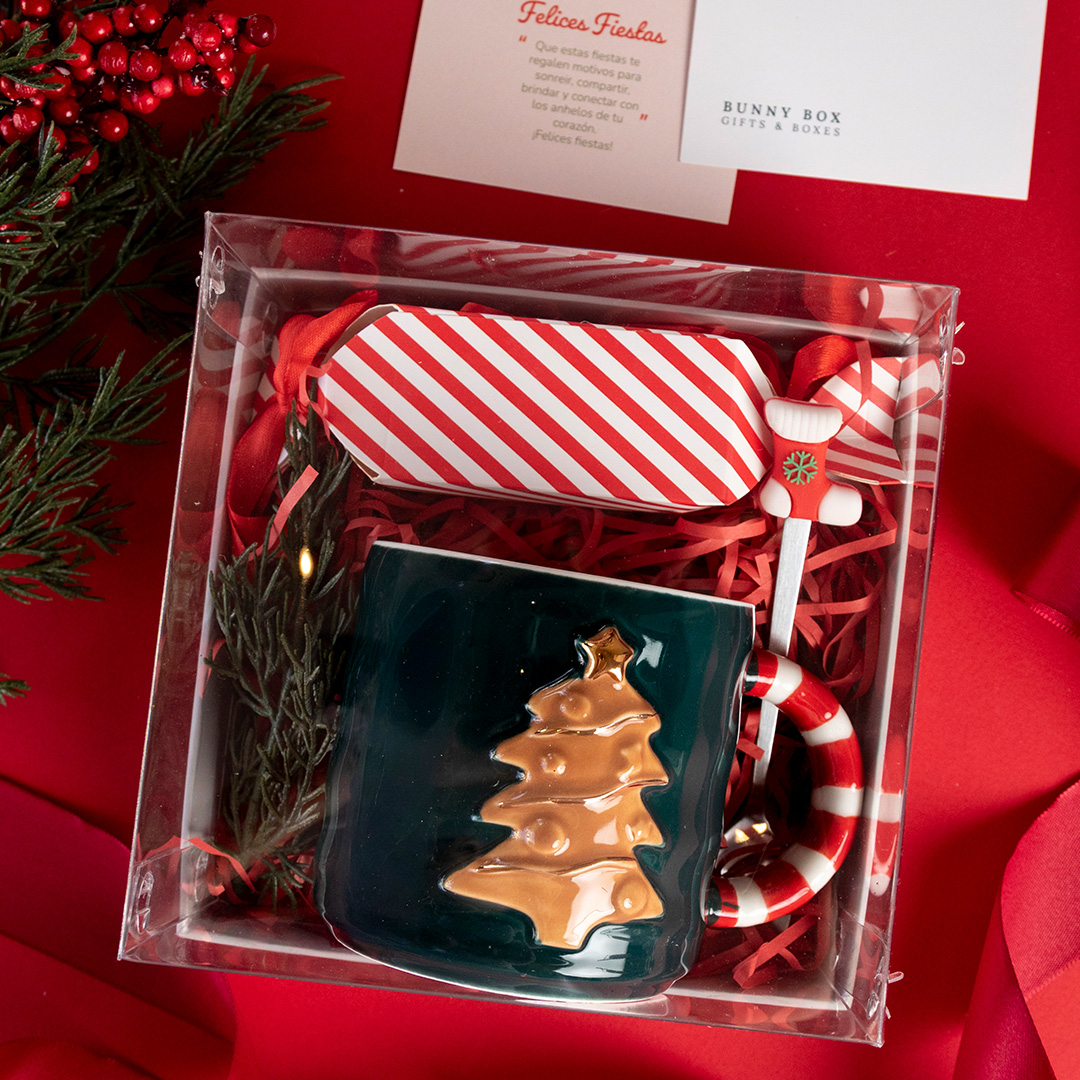Taza de cerámica con diseño navideño a elegir, caja para dulces franjas rojas con 10x chocolates kisses o dulces de caramelo, decoración navideña, empacado caja clear box bandeja tapa acetato, tarjeta dedicatoria acorde a la ocasión.