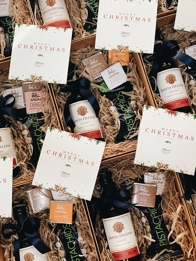 Mini botella de vino Santa Helena 187ml, 3 chocolates Belú Cacao o Barra de chocolate Belú 28gr (según disponibilidad), bolsa de pistachos, empacado en caja de regalo petit color Kraft, papel relleno, listón, decoración y tarjeta navideña.
