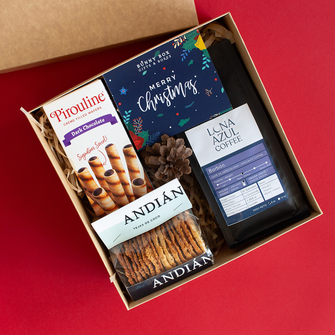 Barquillos Caja Chocolate Pirouline, bolsa de café gourmet Luna Azul, paquete de galletas de coco Andian, empacado en caja tradicional kraft, papel relleno, listón, decoración y tarjeta dedicatoria acorde a la ocasión.