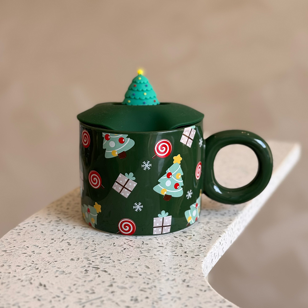 Linda taza de cerámica con mango circular, diseño de pinos y regalos. Incluye tapa de goma.
