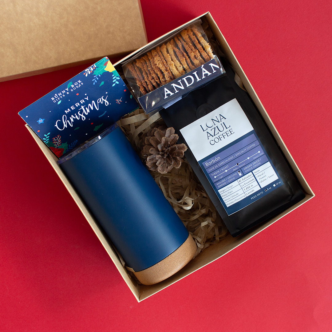 Termo de metal con base de corcho en color azul, bolsa de café gourmet Luna Azul, paquete de galletas de coco Andian, empacado en caja tradicional kraft, papel relleno, listón, decoración y tarjeta dedicatoria acorde a la ocasión.