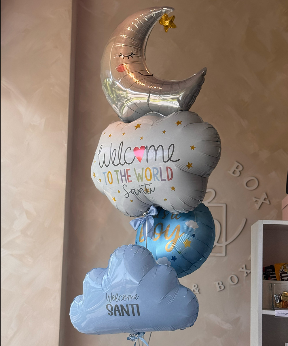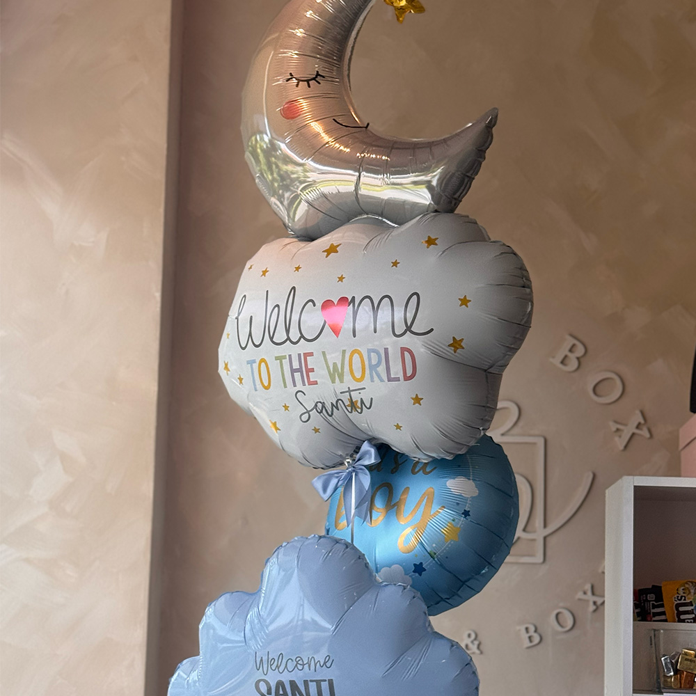 Globo de exclusiva marca italiana foil grande 32 pulgadas en forma de luna y nube con texto “welcome to the world”, agregamos el nombre del bebé sin costo adicional, globo foil redondo 18 pulgadas con temática de bebé según stock niño o niña, globo de nube personalizado con texto “Welcome +nombre de bebé”. Todo amarrado a un mismo contrapeso.